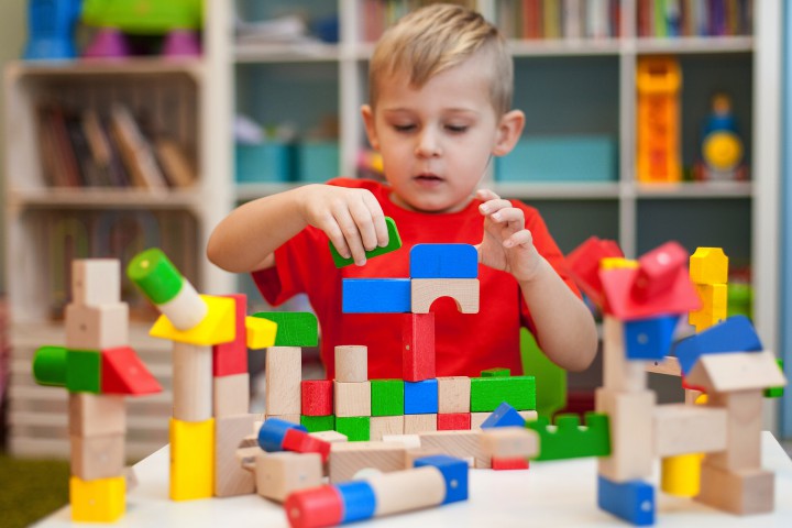 Klocki Kooglo w zestawie zawierającym 300 sztuk polecane do placówek edukacyjnych jak żłobki czy przedszkola.
