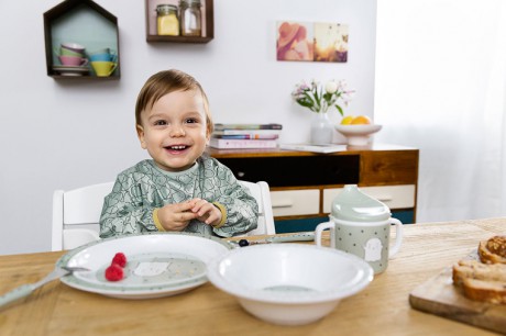 Zestaw "dorosłych" sztućców (widelczyka i łyżki) dla dziecka ze stali nierdzewnej niemieckiej marki LASSIG z kolekcji Little Spookies. Sztućce są lekkie i poręczne dla małych rączek. Mają specjalnie wyprofilowane kształty dla ułatwienia dziecku nabierania jedzenia. Rękojeść z tworzywa – oliwkowa w trójąty z motywem duszka - także została zaprojektowana tak, by idealnie pasować do dziecięcej rączki. Dzięki przewężeniu łatwo ją złapać i utrzymać.